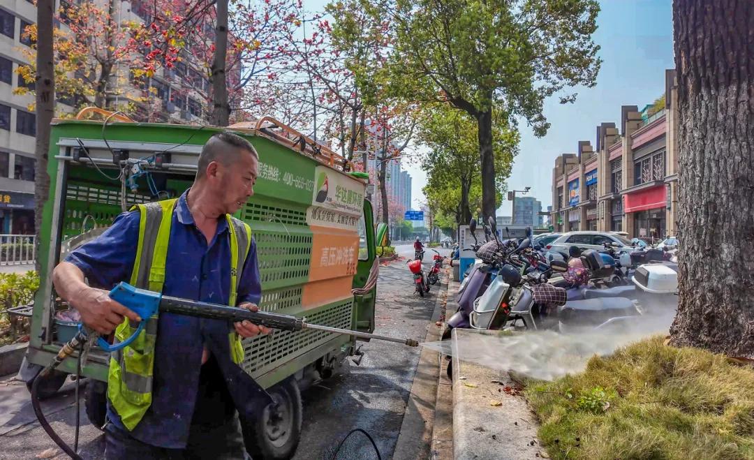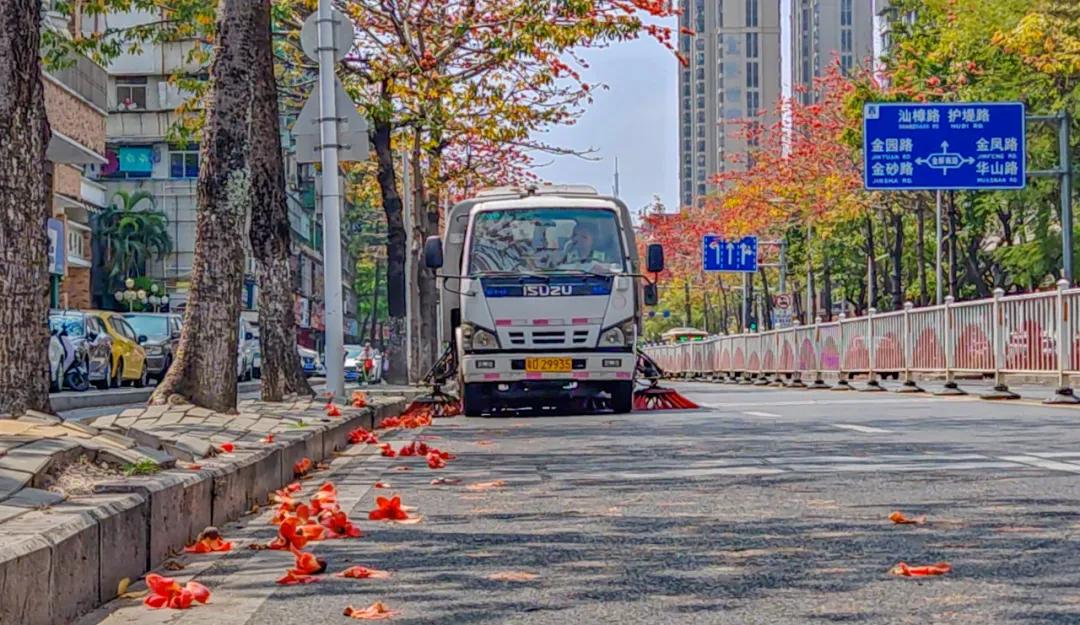 据华达隆城服金砂街道责任主管韩小虎介绍,为了应对木棉花季的清扫压力,他们也想了不少的办法,除通过科学调配人力,在木棉树集中的路段增加保洁、巡查频次和延长作业时间外,还备足工具和清扫车辆,实行“人机结合”的作业模式,用高压冲洗车、鼓风机等“清理神器”,提高清扫效率。许多环卫工人每天清晨四点就已提前到岗,为的就是确保赶到每天早高峰前完成当天的第一次全面普扫。