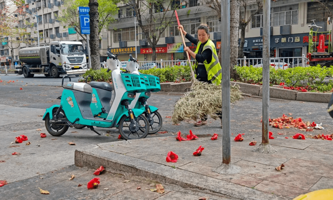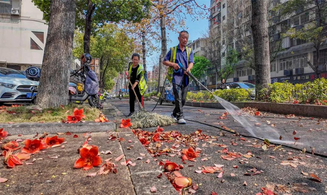 小编了解到,木棉花瓣质地厚实、水分含量高,一旦被车辆碾压,就会紧紧粘连在路面上,用普通扫帚难以彻底清扫,所以,环卫工人只能先用高压冲洗枪将粘连在地面的花朵冲松动后再通过人工将其清理干净。特别是在交通高峰时段,刚清理好的路面往往瞬间又会被碾压出大片“花泥”,环卫工人只能反复清理,丝毫不敢松懈。