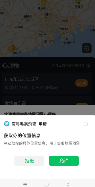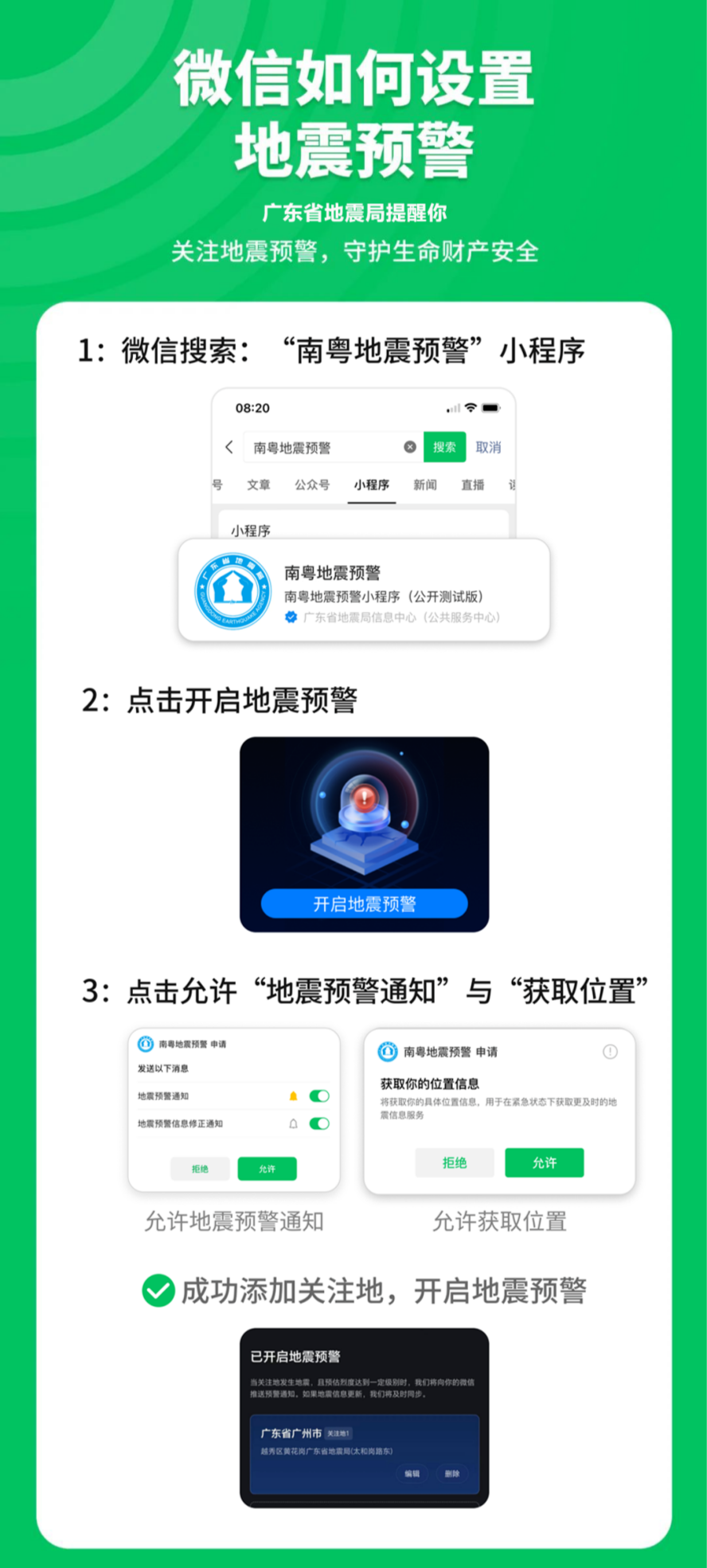 地震预警的每一秒都关乎生命安全。提前设置好地震预警防患于未然,其实获取地震预警信息非常简单,只需扫码关注广东省地震局官方推出的“南粤地震预警”小程序,完成授权并添加关注地,即可实时接收广东省及周边地区最新地震预警信息。