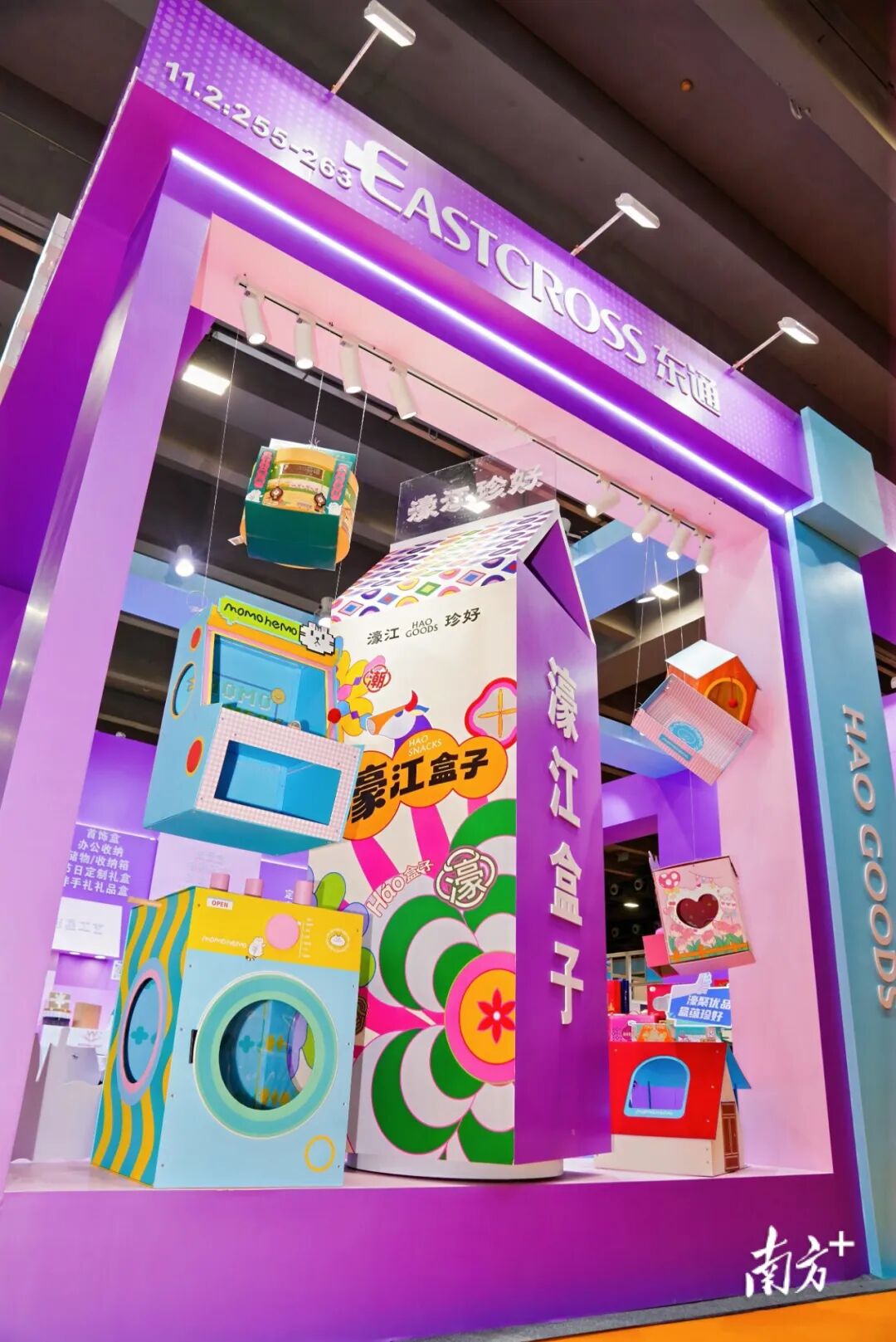 9月12日至14日,首届广东优品展览会在广交会B区展馆举行。当客商步入玩具文创展区,一个巨型紫色盒子的特装陈设瞬间抓住所有人的目光。硕大的招牌上,“濠江盒子”四个大字格外醒目,展位四周悬挂着各式各样、形态万千的包装盒,令人一目了然:这定是与包装印刷相关联的企业展位。