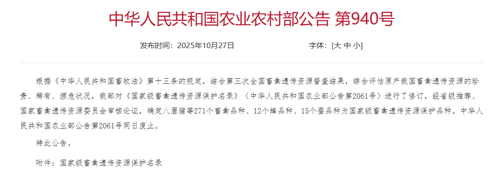 日前,农业农村部发布第940号公告,对《国家级畜禽遗传资源保护名录》进行重要修订。经严格评审,确定271个畜禽品种、12个蜂品种、15个蚕品种被正式列为国家级保护资源。