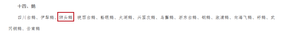 四川白鹅、伊犁鹅、狮头鹅、皖西白鹅、豁眼鹅、太湖鹅、兴国灰鹅、乌鬃鹅、浙东白鹅、钢鹅、溆浦鹅、向海飞鹅、籽鹅、武冈铜鹅、云南鹅