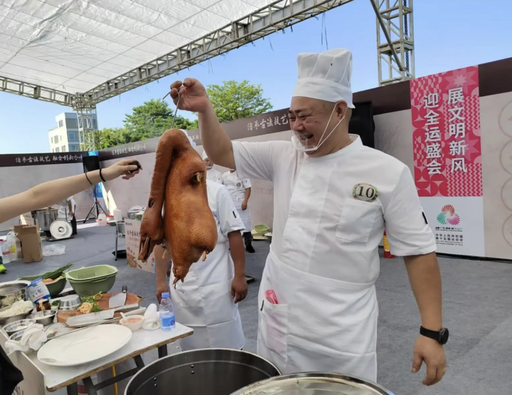 从“潮汕卤鹅”的古法潮菜,到“菠萝炒鹅胗”“鹅肉炒饭”的创新菜,厨师们以娴熟的刀工对鹅肉进行烹制,诱人飘香的美食不断出炉……赛场之上,厨师们挥刀斩件、掌勺颠锅,锅铲碰撞声、评委点评声与来宾的赞叹声交织在一起。