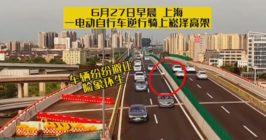 2022年6月27日7时许,上海青浦区崧泽高架南侧G15沈海高速路段处,一辆电动自行车在高架道路上由东向西逆向骑行,与高速行驶的机动车对向擦肩而过,险象环生。最终,一辆白色小轿车避让不及,与电动自行车相撞,造成电动自行车驾驶人姚某受伤,后经医院抢救无效死亡。
