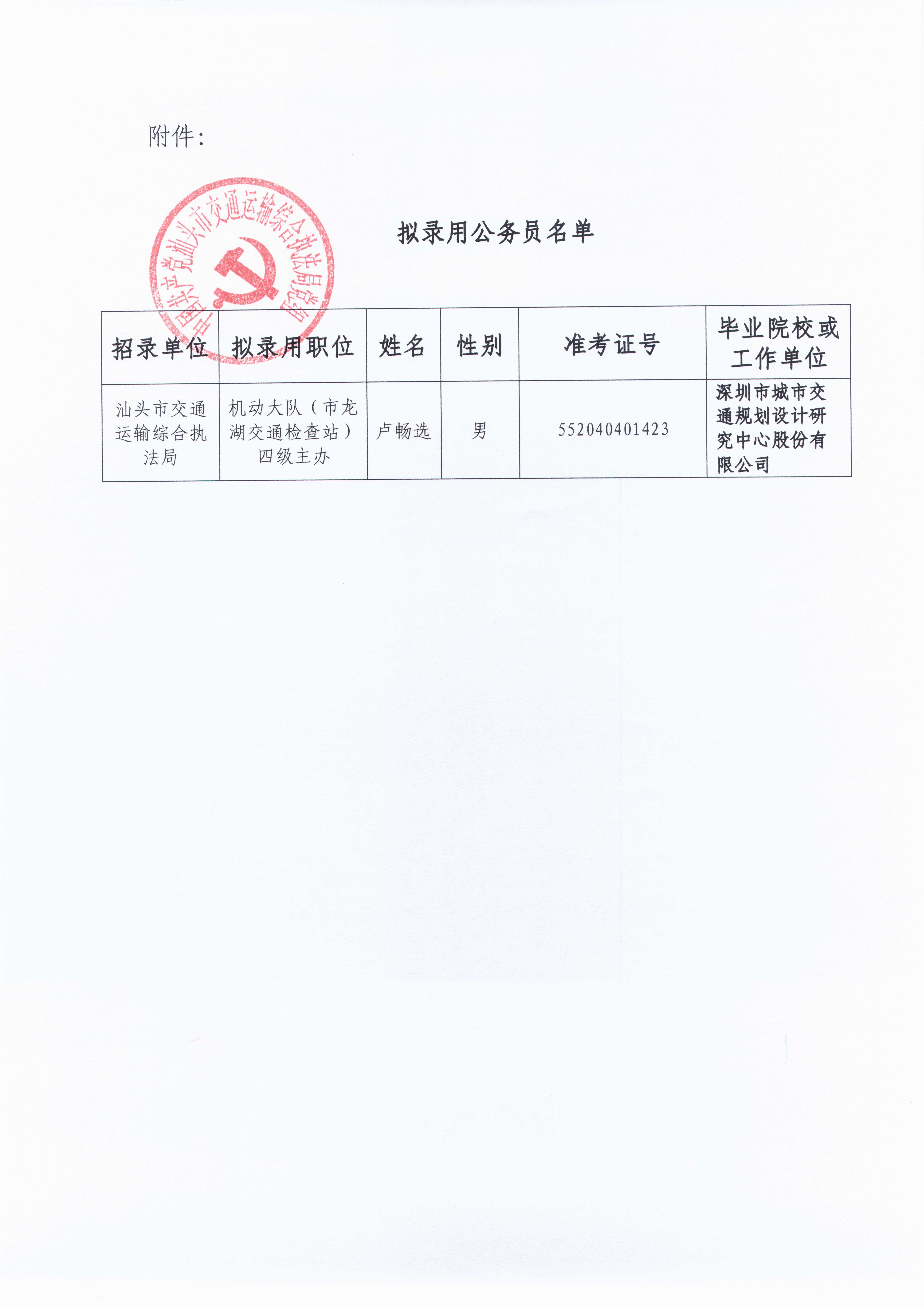 汕头市交通运输综合执法局2023年拟录用公务员公示