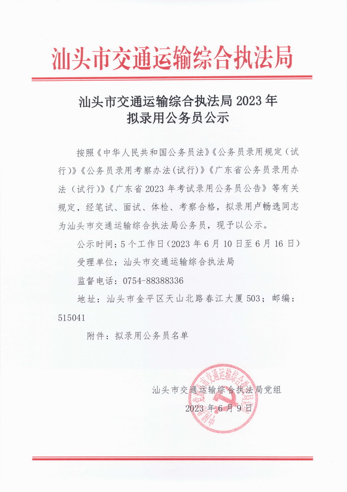 汕头市交通运输综合执法局2023年拟录用公务员公示