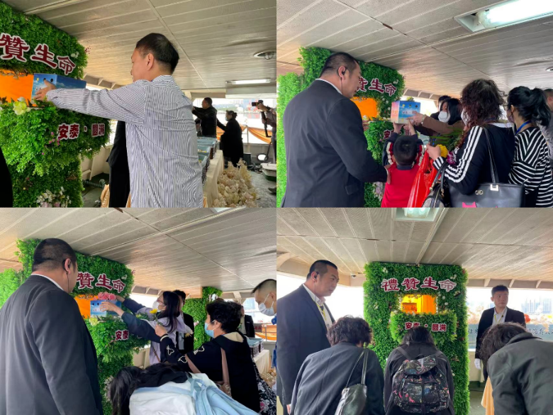 入海为尊,向海而生。上午10时许,船只行至指定海域,随着三声汽笛声响起,家属们在工作人员的引导下,手捧可降解骨灰盒送至礼赞生命门,先人骨灰伴着鲜花和音乐缓缓沉入大海,枕浪长眠,与海共生。期间,主持人旁白:“在人生旅途的最后一程,选择回归自然的方式,不占土地,不刻墓碑,让我们的先人伴着海风,随着海浪在平静、大爱的气氛中缓缓流向另一个期待,回归大海怀抱,让生命传递,让思念永存……”,家属们或轻拭泪水、依依惜别,至此长眠于海;或闭上双眼、默念祷告,逝者永安息;或沉默不语、远眺海面,往事浮现心头……随后,全体人员集体默哀,工作人员致祭文,并敬献鲜花。至上午11时,活动圆满结束并返航。当天下午和4月8日将继续组织3场骨灰集体海葬活动,经统计,本次活动共超1700份先人骨灰回归自然,溶存大海。
