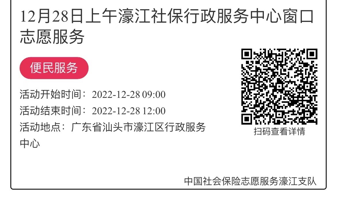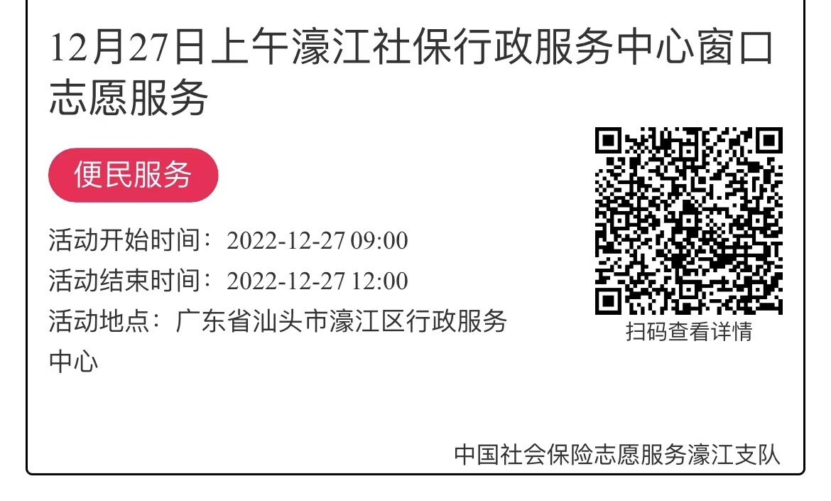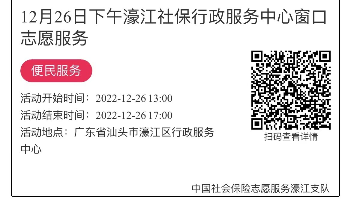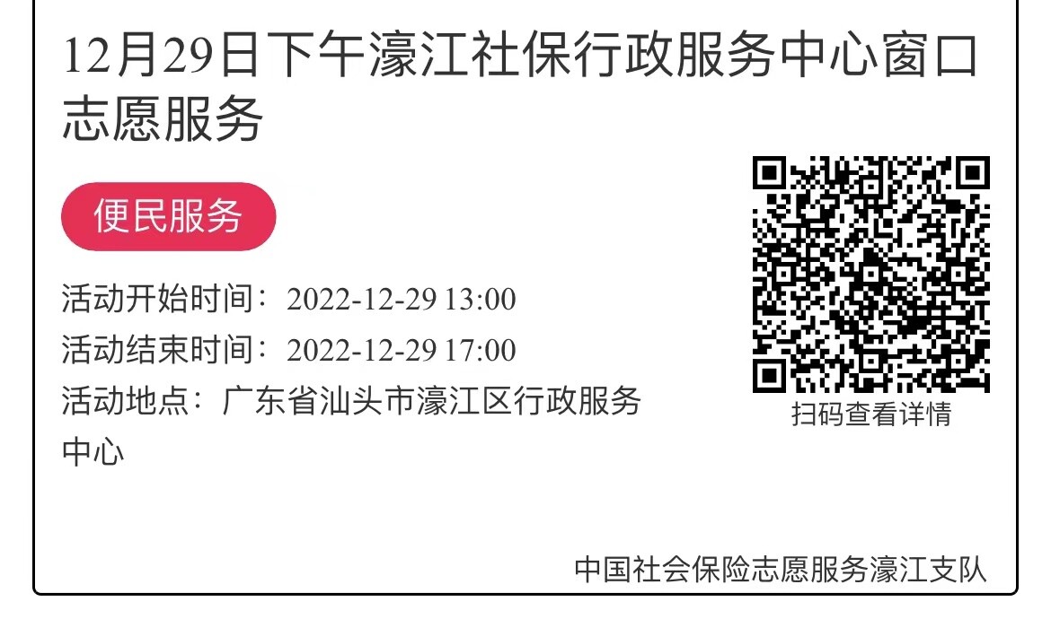 2022年12月26日至12月30日市社保局濠江分局驻行政服务中心窗口志愿服务活动,需要每一个可爱的你参与!