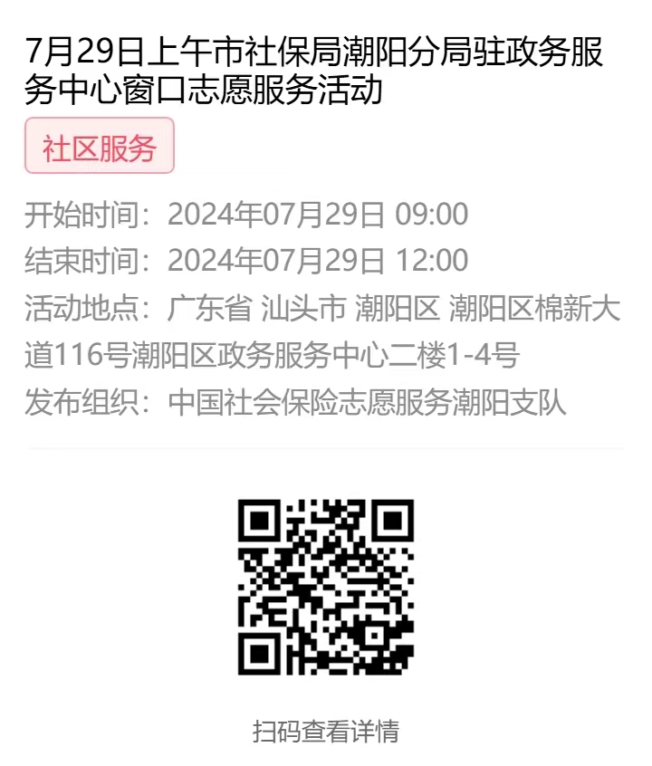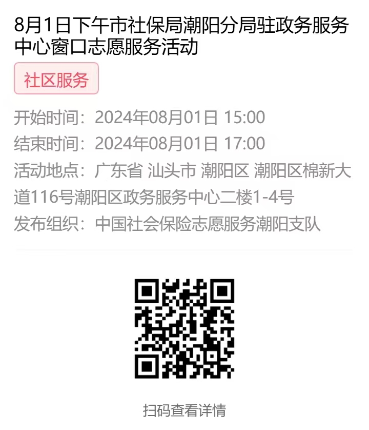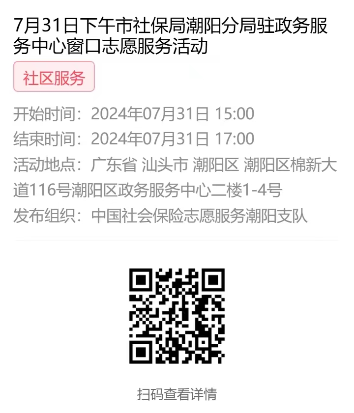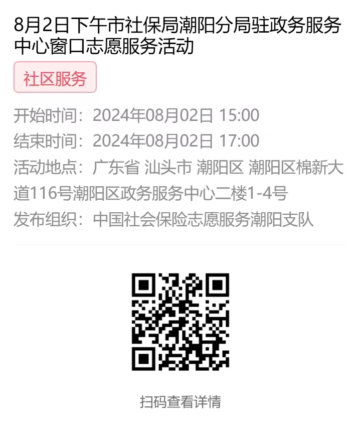 2024年7月29日至8月2日市社保局潮阳分局驻政务服务中心窗口志愿服务活动,需要每一个可爱的你参与!