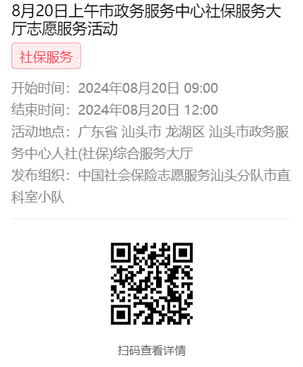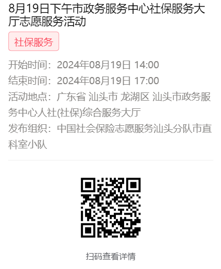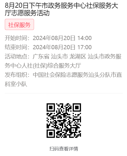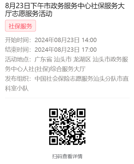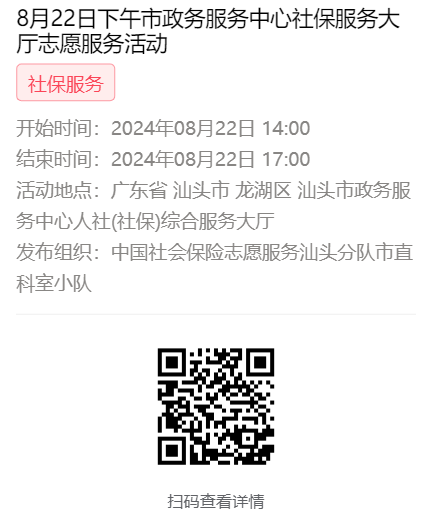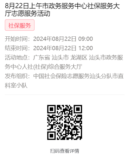 为充分保障我市社保志愿者权益,自2022年10月18日起,报名参加汕头市社保局和各分局志愿活动的同志须持有志愿者证并已激活,请各位志愿者遵照执行。