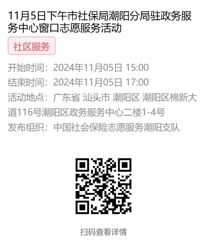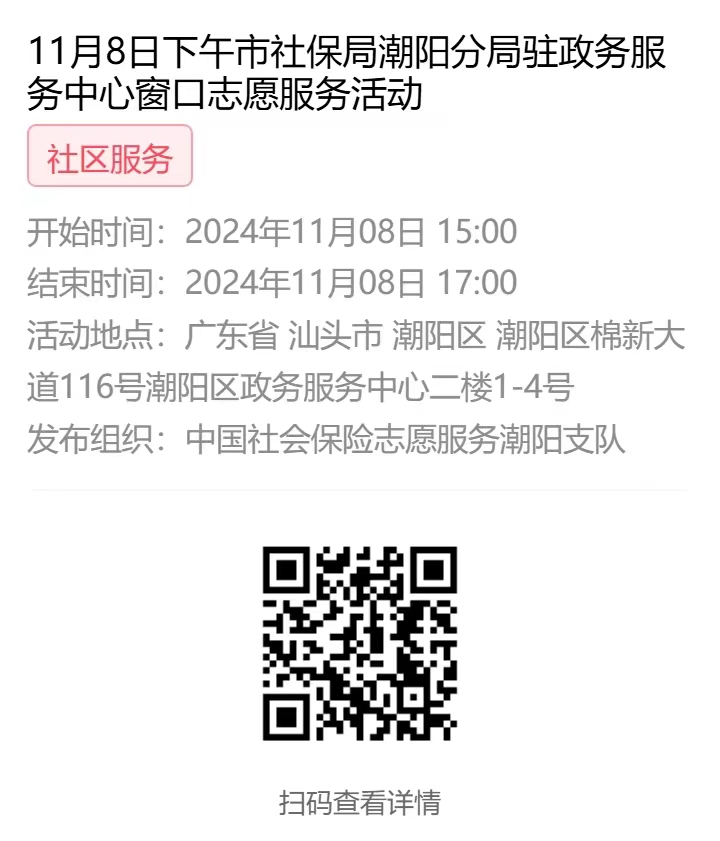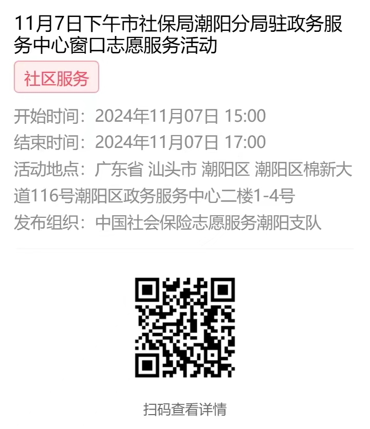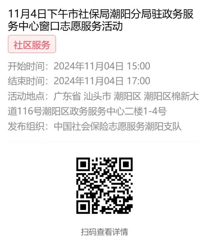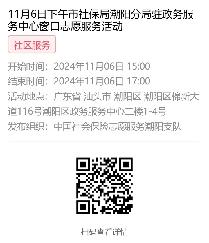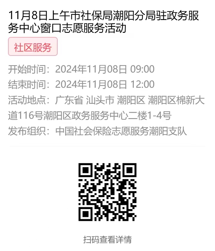 2024年11月4日至11月8日市社保局潮阳分局驻政务服务中心窗口志愿服务活动,需要每一个可爱的你参与!
