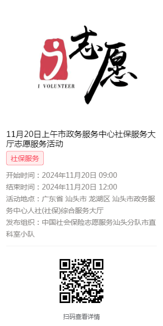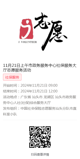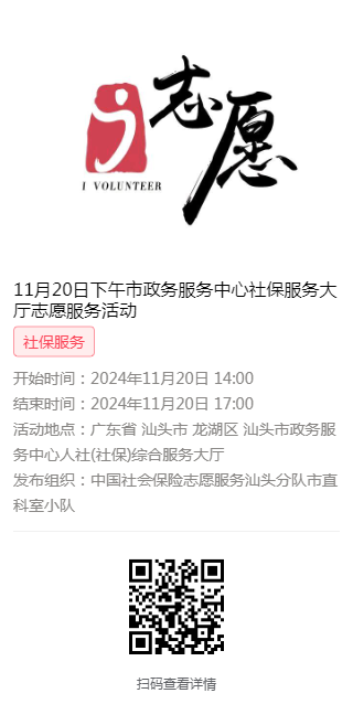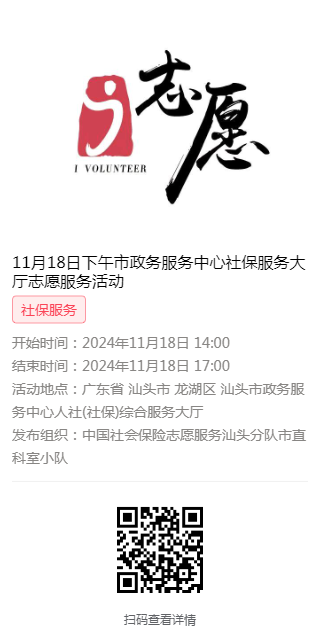 为充分保障我市社保志愿者权益,自2022年10月18日起,报名参加汕头市社保局和各分局志愿活动的同志须持有志愿者证并已激活,请各位志愿者遵照执行。