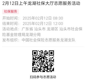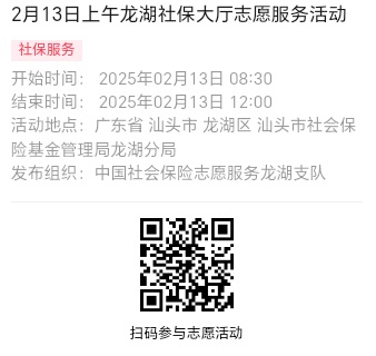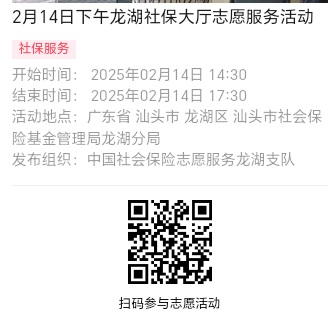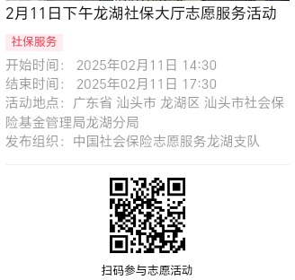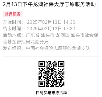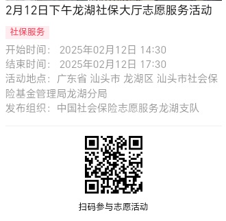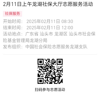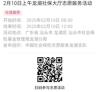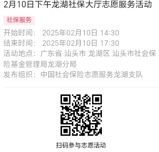 2025年2月10日至2025年2月14日市社保局龙湖分局大厅志愿服务活动,需要每一个可爱的你参与!