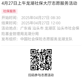 2025年4月27日至2025年4月30日市社保局龙湖分局大厅志愿服务活动,需要每一个可爱的你参与!