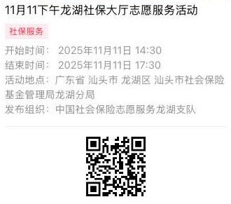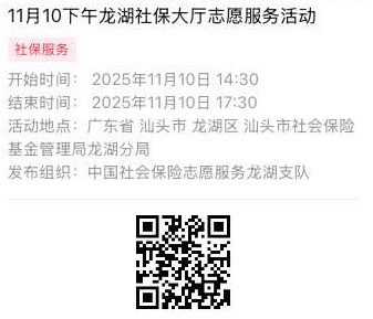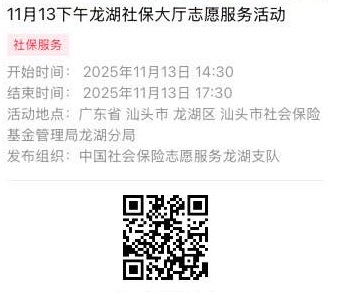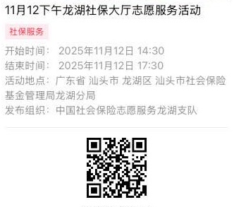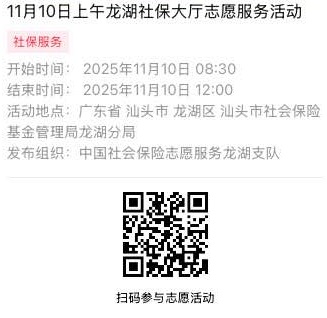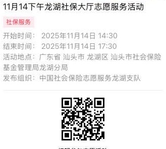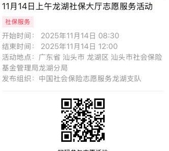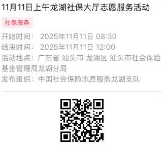2025年11月10日至2025年11月14日市社保局龙湖分局大厅志愿服务活动,需要每一个可爱的你参与!