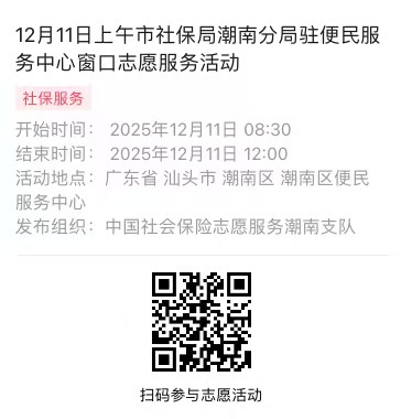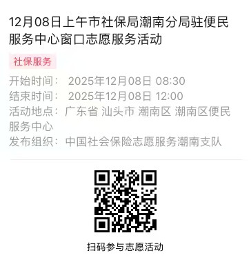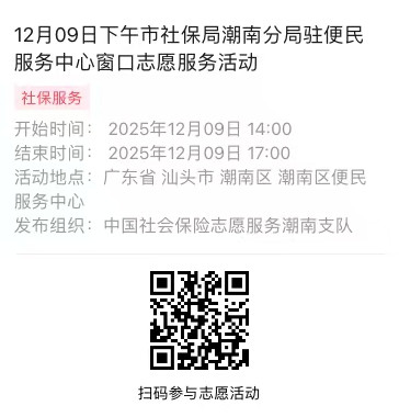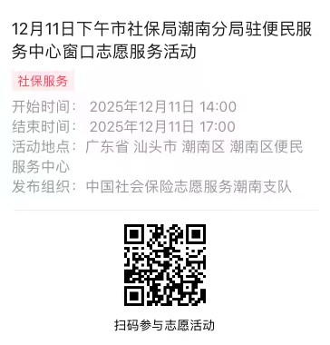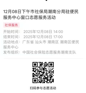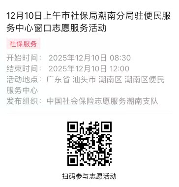 2025年12月8日至12月12日市社保局潮南分局驻便民服务中心窗口志愿服务活动,需要每一个可爱的你参与!