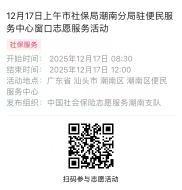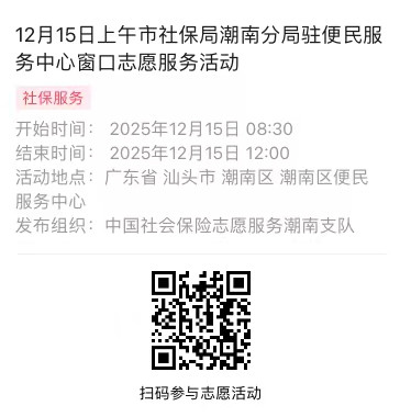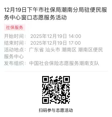 2025年12月15日至12月19日市社保局潮南分局驻便民服务中心窗口志愿服务活动,需要每一个可爱的你参与!