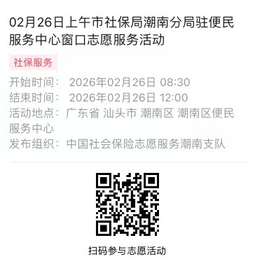 2026年02月24日至02月28日市社保局潮南分局驻便民服务中心窗口志愿服务活动,需要每一个可爱的你参与!
