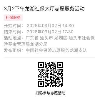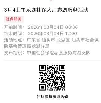 2026年3月2日至2026年3月6日市社保局龙湖分局大厅志愿服务活动,需要每一个可爱的你参与!