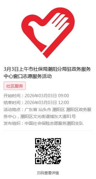 2026年3月2日至3月6日市社保局潮阳分局驻政务服务中心窗口志愿服务活动,需要每一个可爱的你参与!