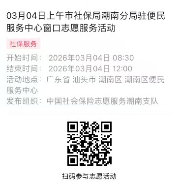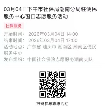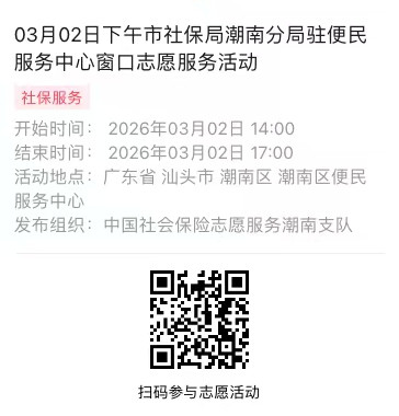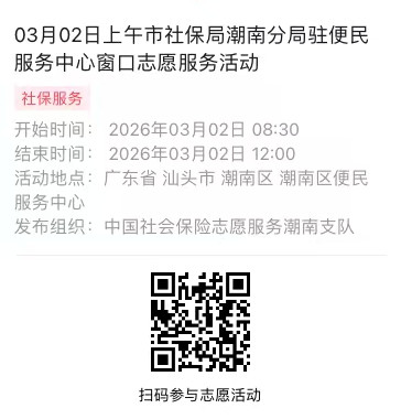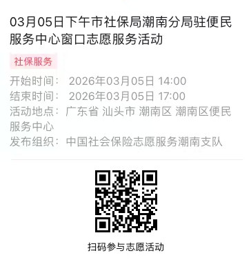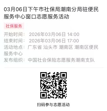 2026年03月02日至03月06日市社保局潮南分局驻便民服务中心窗口志愿服务活动,需要每一个可爱的你参与!
