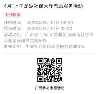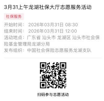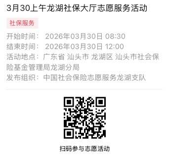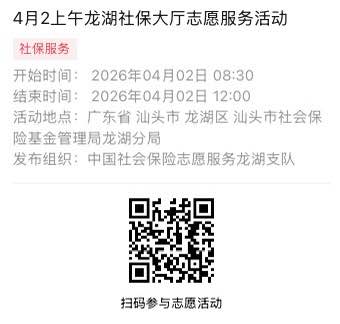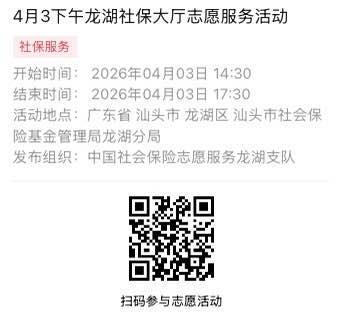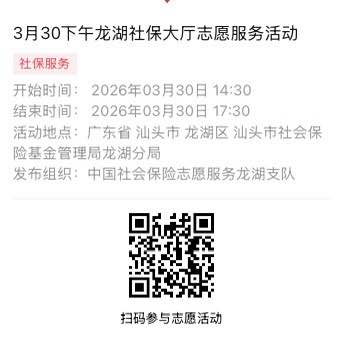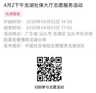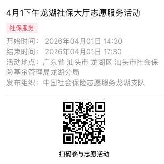 2026年3月30日至2026年4月3日市社保局龙湖分局大厅志愿服务活动,需要每一个可爱的你参与!