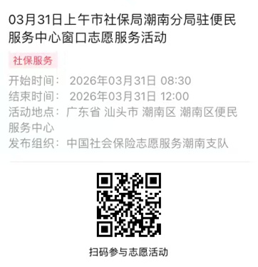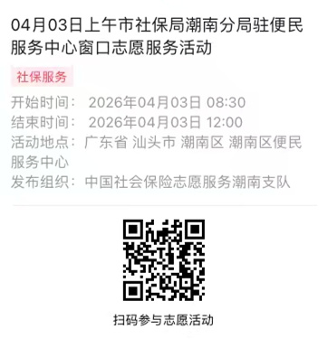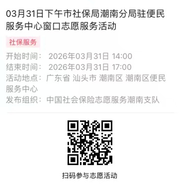 2026年03月30日至04月03日市社保局潮南分局驻便民服务中心窗口志愿服务活动,需要每一个可爱的你参与!