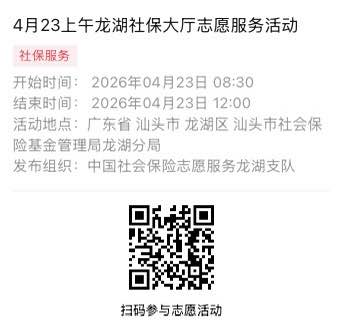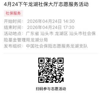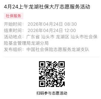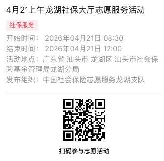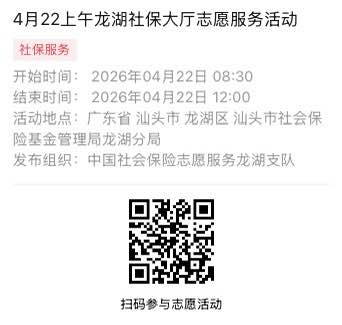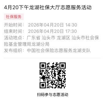 2026年4月20日至2026年4月24日市社保局龙湖分局大厅志愿服务活动,需要每一个可爱的你参与!
