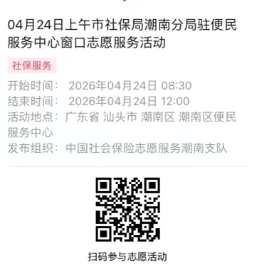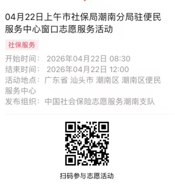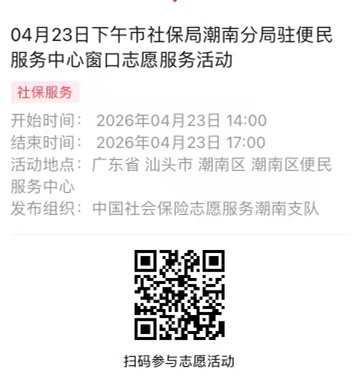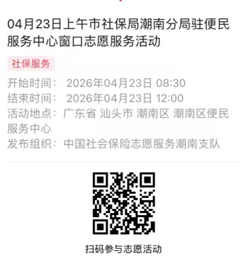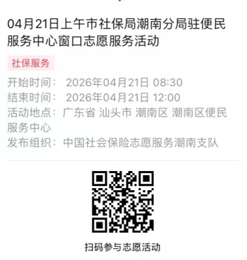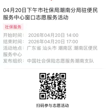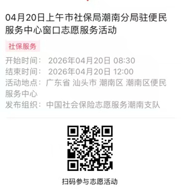 2026年04月20日至04月24日市社保局潮南分局驻便民服务中心窗口志愿服务活动,需要每一个可爱的你参与!