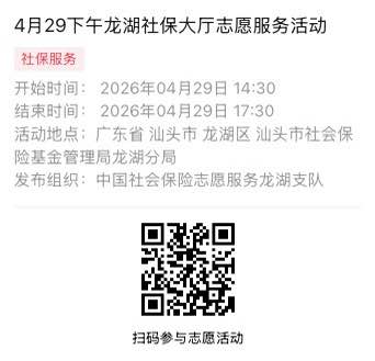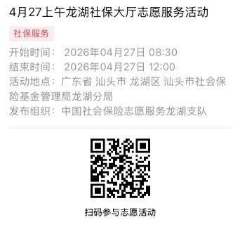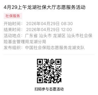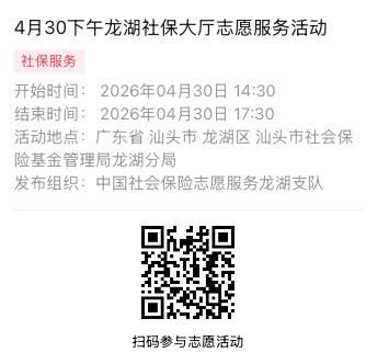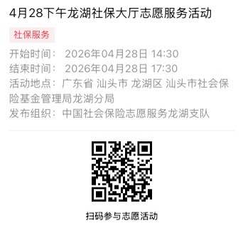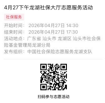 2026年4月27日至2026年4月30日市社保局龙湖分局大厅志愿服务活动,需要每一个可爱的你参与!