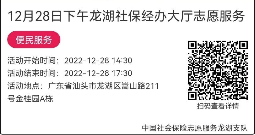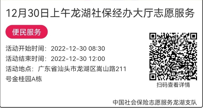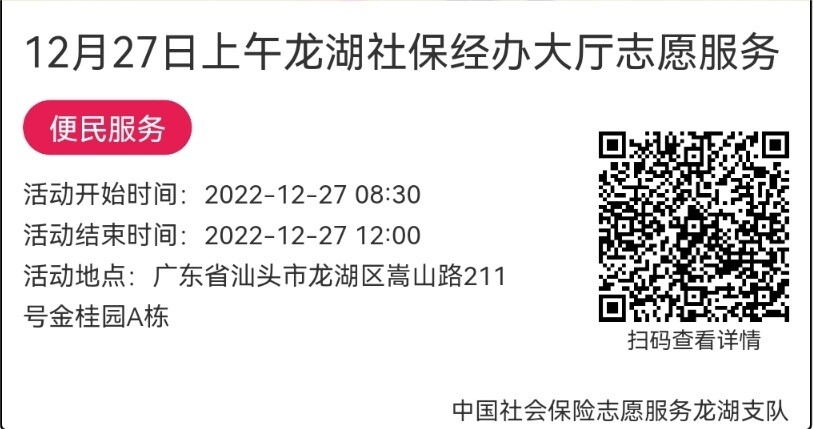 2022年12月26日至12月30日市社保局龙湖分局大厅志愿服务活动,需要每一个可爱的你参与!