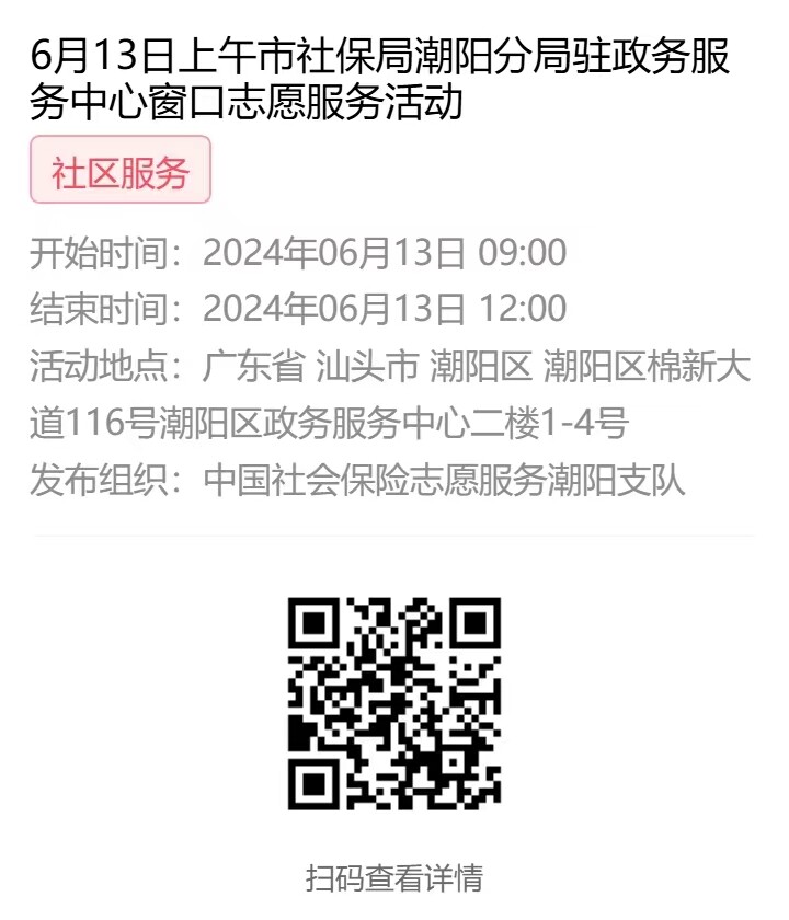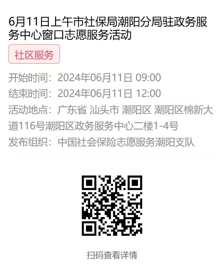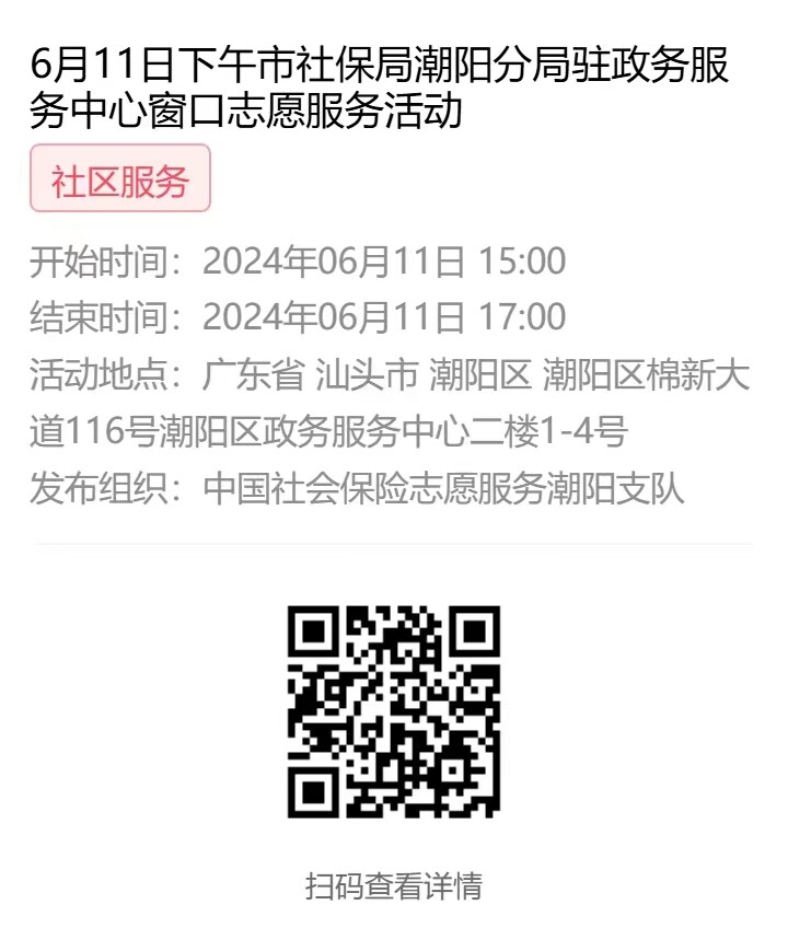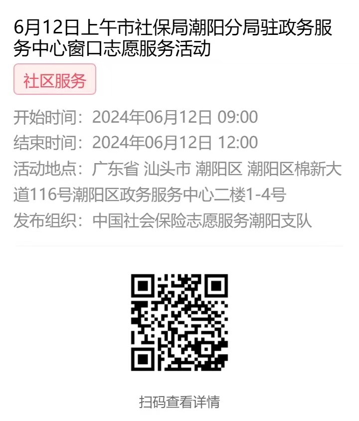 2024年6月11日至6月14日市社保局潮阳分局驻政务服务中心窗口志愿服务活动,需要每一个可爱的你参与!
