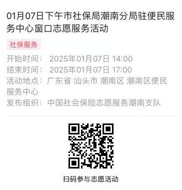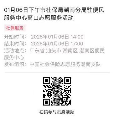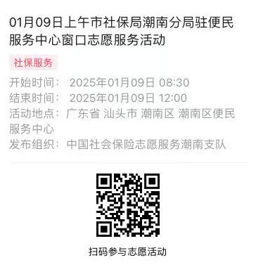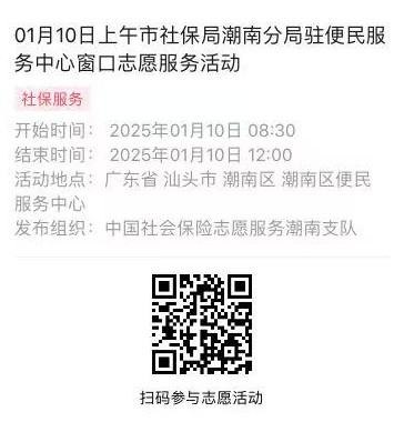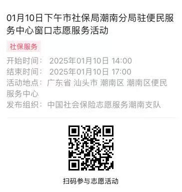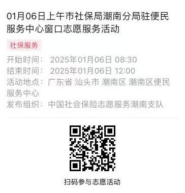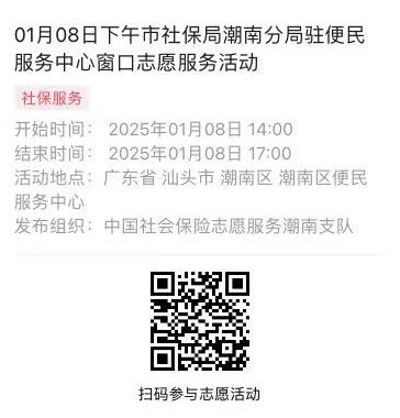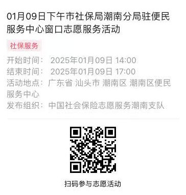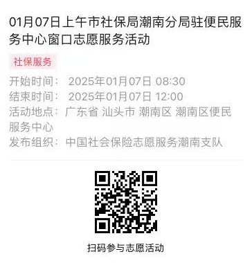 2025年01月06日至01月10日市社保局潮南分局驻便民服务中心窗口志愿服务活动,需要每一个可爱的你参与!