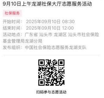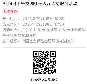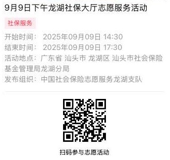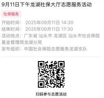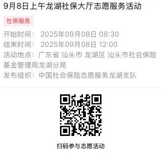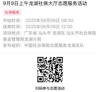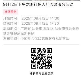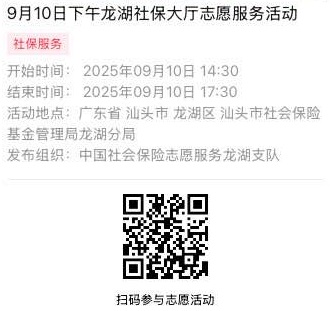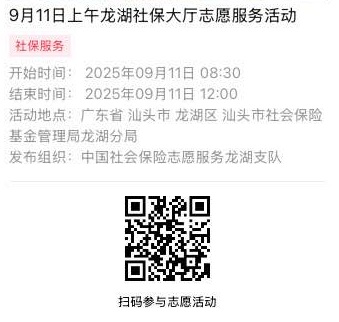 2025年9月8日至2025年9月12日市社保局龙湖分局大厅志愿服务活动,需要每一个可爱的你参与!