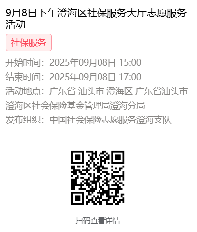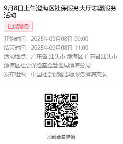 2025年9月8日至9月12日市社保局澄海分局大厅志愿服务活动,需要每一个可爱的你参与!