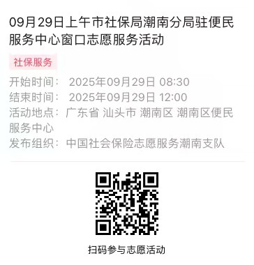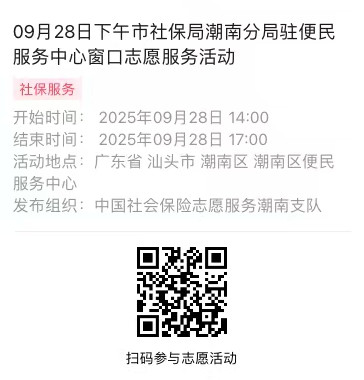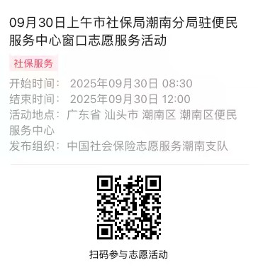 2025年09月28日至09月30日市社保局潮南分局驻便民服务中心窗口志愿服务活动,需要每一个可爱的你参与!