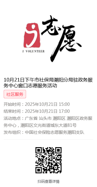 2025年10月20日至10月24日市社保局潮阳分局驻政务服务中心窗口志愿服务活动,需要每一个可爱的你参与!