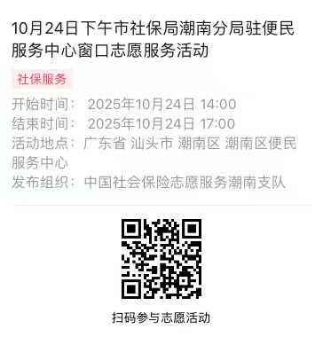 2025年10月20日至10月24日市社保局潮南分局驻便民服务中心窗口志愿服务活动,需要每一个可爱的你参与!