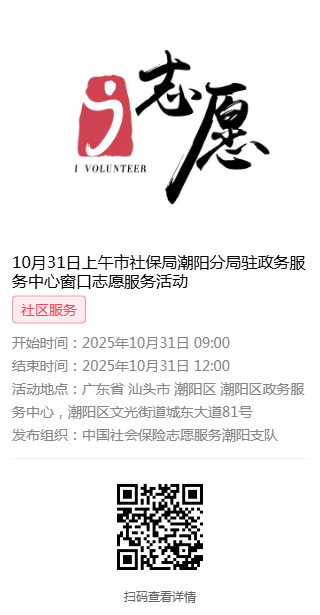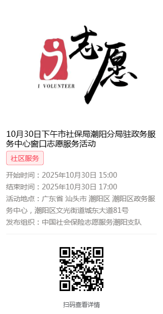 2025年10月27日至10月31日市社保局潮阳分局驻政务服务中心窗口志愿服务活动,需要每一个可爱的你参与!