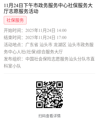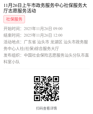 为充分保障我市社保志愿者权益,自2022年10月18日起,报名参加汕头市社保局和各分局志愿活动的同志须持有志愿者证并已激活,请各位志愿者遵照执行。