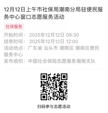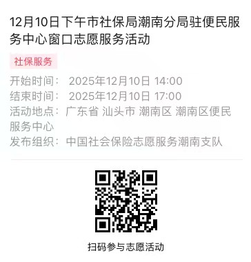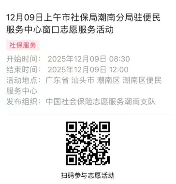 2025年12月8日至12月12日市社保局潮南分局驻便民服务中心窗口志愿服务活动,需要每一个可爱的你参与!