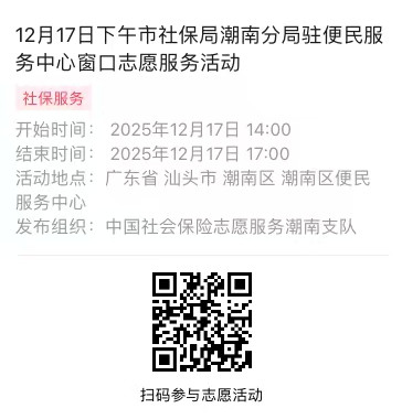 2025年12月15日至12月19日市社保局潮南分局驻便民服务中心窗口志愿服务活动,需要每一个可爱的你参与!