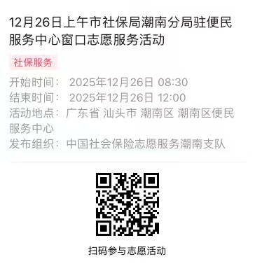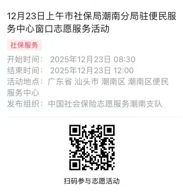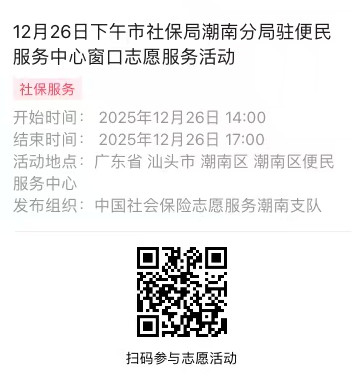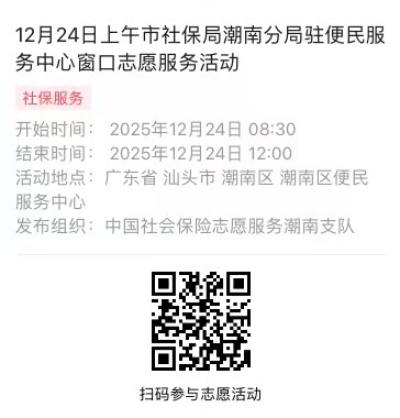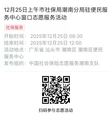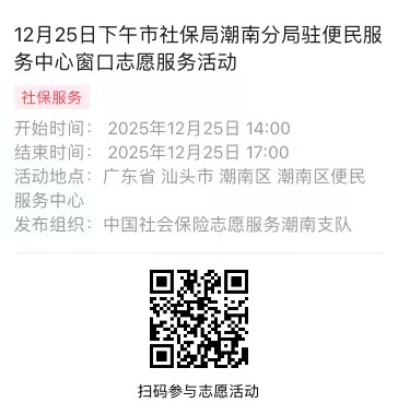 2025年12月22日至12月26日市社保局潮南分局驻便民服务中心窗口志愿服务活动,需要每一个可爱的你参与!