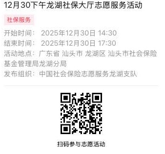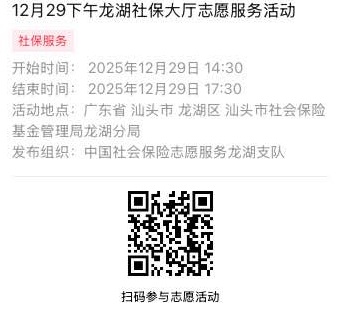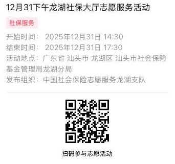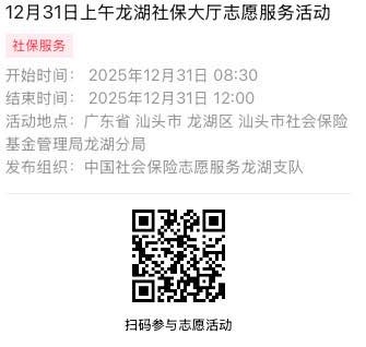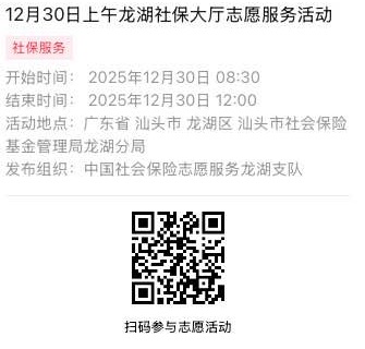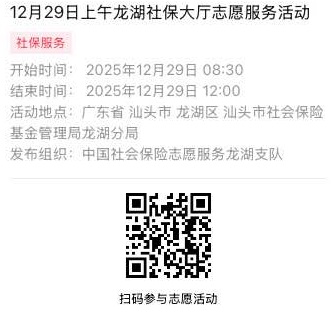 2025年12月29日至2025年12月31日市社保局龙湖分局大厅志愿服务活动,需要每一个可爱的你参与!