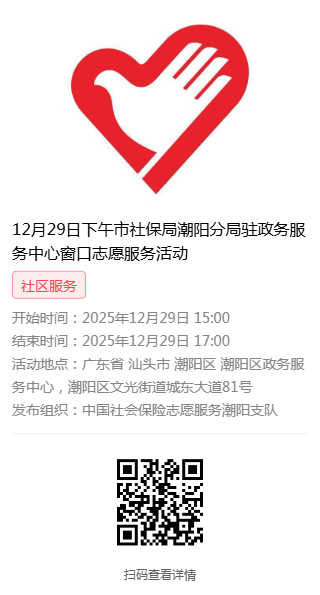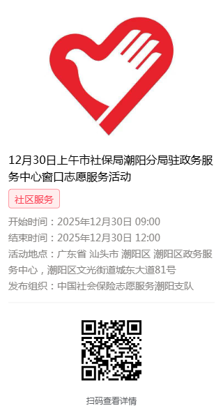 2025年12月29日至12月31日市社保局潮阳分局驻政务服务中心窗口志愿服务活动,需要每一个可爱的你参与!