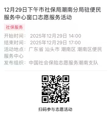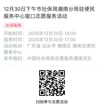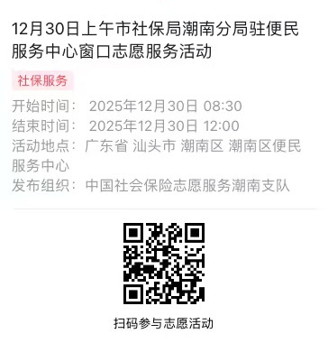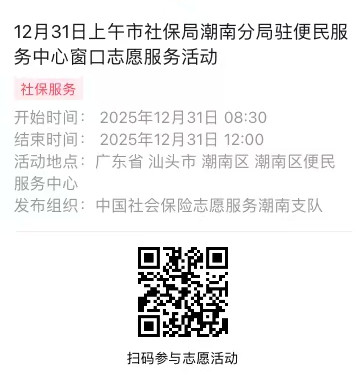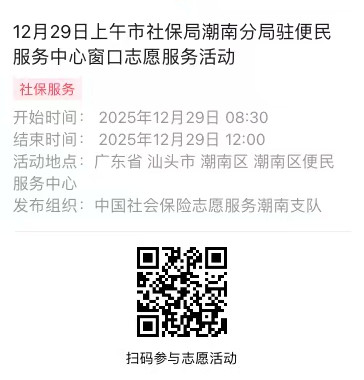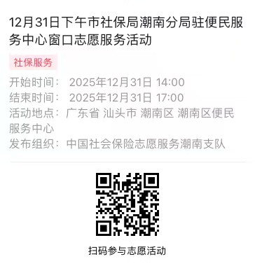 2025年12月29日至12月31日市社保局潮南分局驻便民服务中心窗口志愿服务活动,需要每一个可爱的你参与!