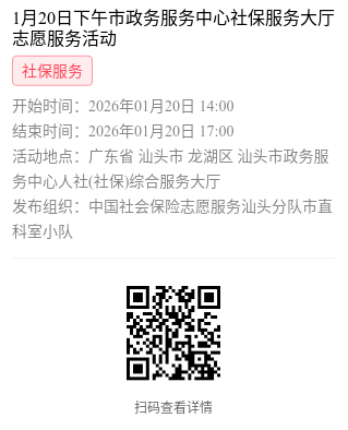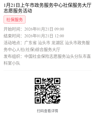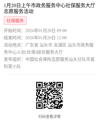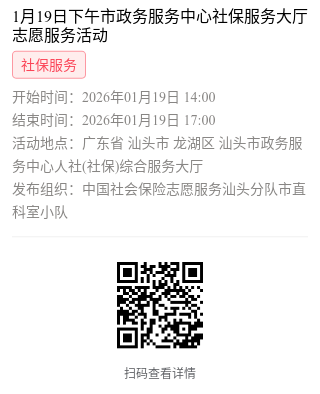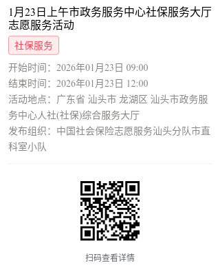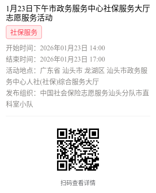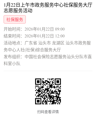 为充分保障我市社保志愿者权益,自2022年10月18日起,报名参加汕头市社保局和各分局志愿活动的同志须持有志愿者证并已激活,请各位志愿者遵照执行。