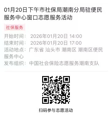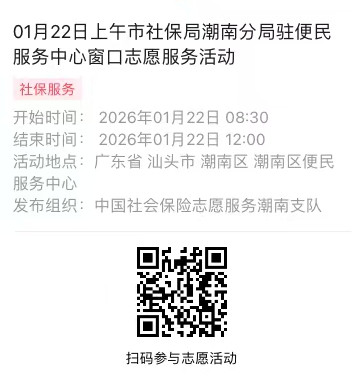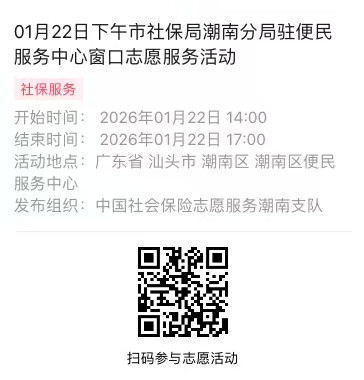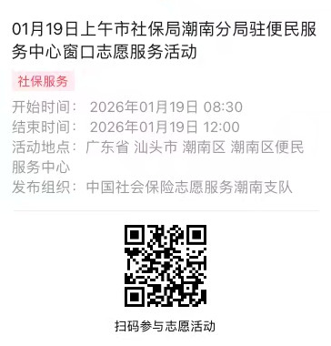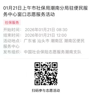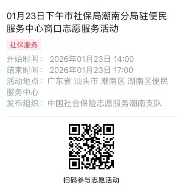 2026年01月19日至01月23日市社保局潮南分局驻便民服务中心窗口志愿服务活动,需要每一个可爱的你参与!