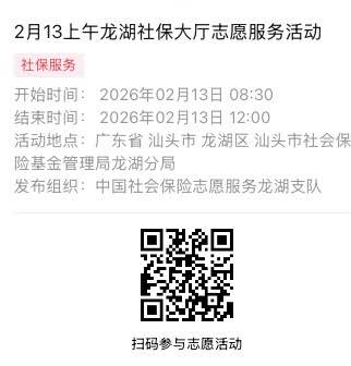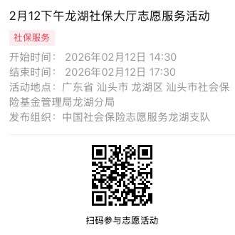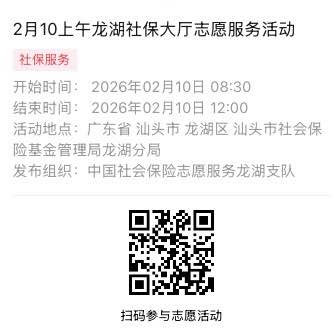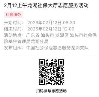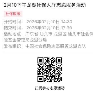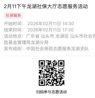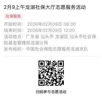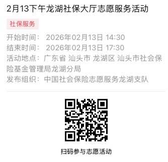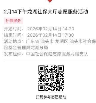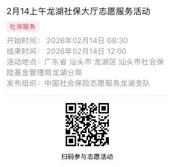 2026年2月9日至2026年2月14日市社保局龙湖分局大厅志愿服务活动,需要每一个可爱的你参与!