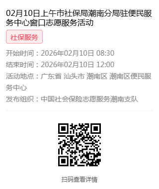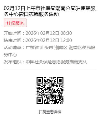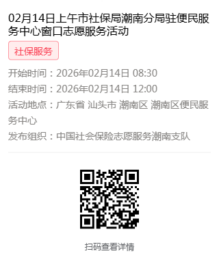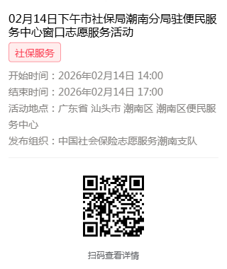 2026年02月09日至02月14日市社保局潮南分局驻便民服务中心窗口志愿服务活动,需要每一个可爱的你参与!